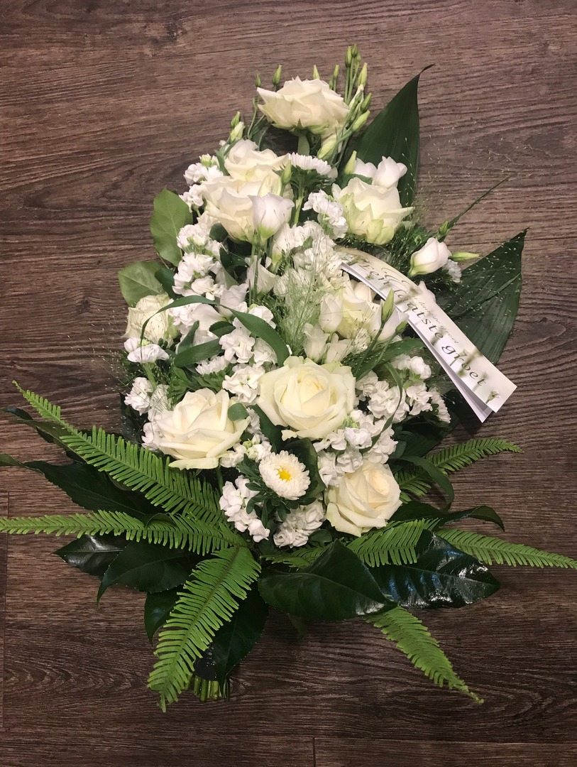 Een krachtig rouwboeket in rode tinten, zorgvuldig gesteld door onze ervaren bloemisten. Het boeket op de foto dient als voorbeeld: we werken in dezelfde sfeer en kleuren, maar de exacte bloemen kunnen variëren afhankelijk van het verse aanbod en seizoen. Zo ben je verzekerd van een prachtig rouwboeket van verse bloemen, met een warme en liefdevolle uitstraling. Dit product is een rouwboeket. Dat betekent dat de bloemen los zijn gebonden, met vrije stelen, en niet in steekschuim (oasis) zijn verwerkt. Een rouwboeket is speciaal geschikt om mooi neer te leggen op of naast de kist. De grootte kan afwijken van de foto, maar wordt altijd naar verhouding van de prijs gemaakt en mooi tonend.